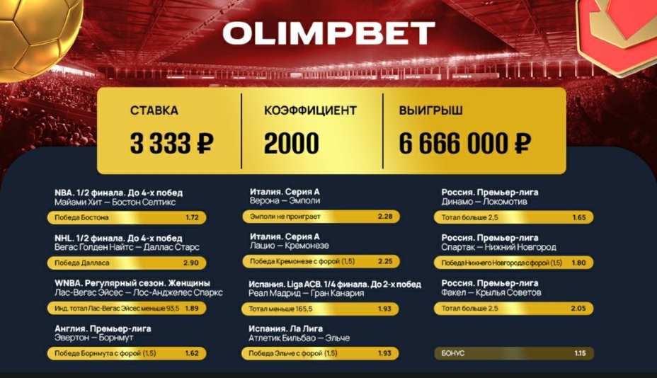 Игрок добавил в экспресс 11 игр из разных видов спорта: семь футбольных матчей (три из РПЛ, два из Серии А, по одному из Ла Лиги и АПЛ), один хоккейный (из НХЛ) и три баскетбольных (по одному из НБА, WNBA и испанской Лиги ACB). Беттер набил максимально возможный в Olimpbet коэффициент — 2000.00.
