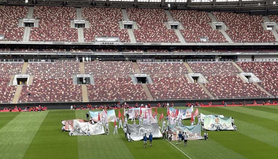 В этом году Российский футбольный союз замахнулся на самое массовое предматчевое шоу в истории. Одновременно на поле выйдут более 500 артистов. Трибуну D частично переделали в сцену с 39-ю экранами. Завтра там появится рэпер Баста. А шоу на поле — уже сегодня.