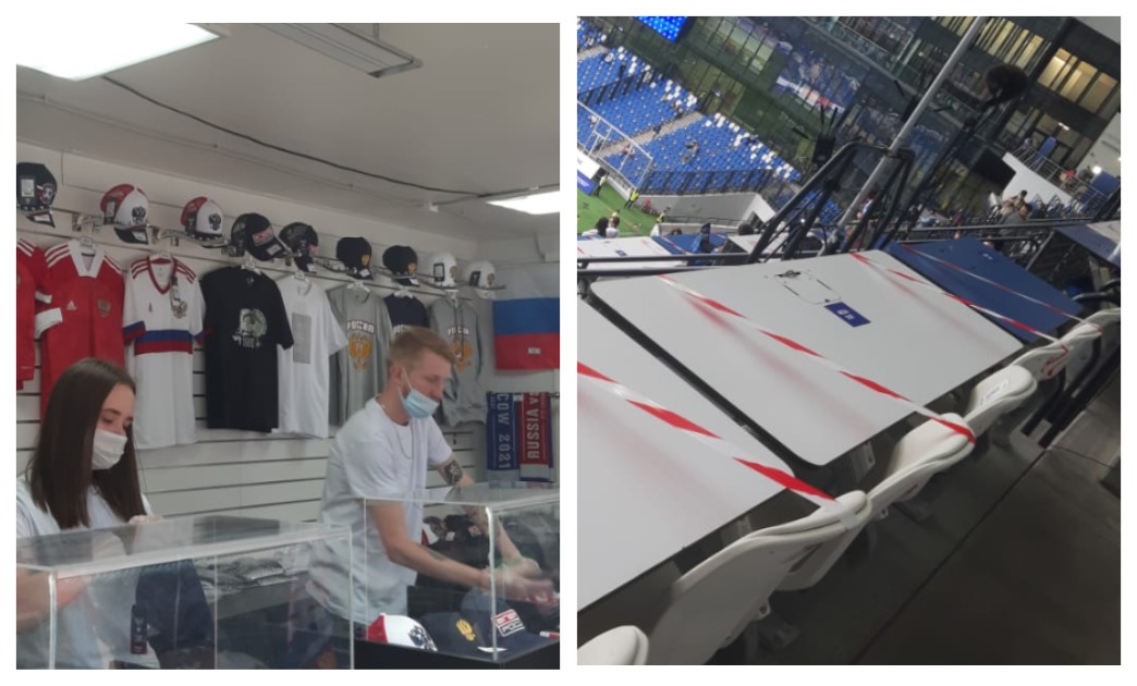 При входе на стадион болельщиков тщательно досматривают. Причем, не только вещи. Очень внимательно читают надписи на майках – на предмет запрещенных. В майках с какими именно надписями запрещено входить на матч сборной России сотрудники арены ответить затруднились, сообщает корреспондент «КП Спорт». Также на входе и на самой арене очень строгие антиковидные меры – столы в ложе прессы через определенные промежутки обтянуты ограничительными лентами.