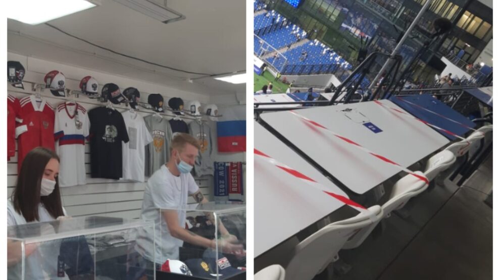 При входе на стадион болельщиков тщательно досматривают. Причем, не только вещи. Очень внимательно читают надписи на майках – на предмет запрещенных. В майках с какими именно надписями запрещено входить на матч сборной России сотрудники арены ответить затруднились, сообщает корреспондент «КП Спорт». Также на входе и на самой арене очень строгие антиковидные меры – столы в ложе прессы через определенные промежутки обтянуты ограничительными лентами.