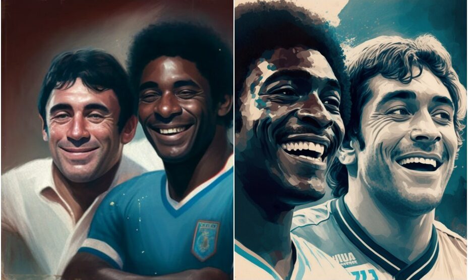 «Пеле и Марадона, молодые и улыбаются, в раю», — гласит подпись к изображениям двух величайших игроков мирового футбола.