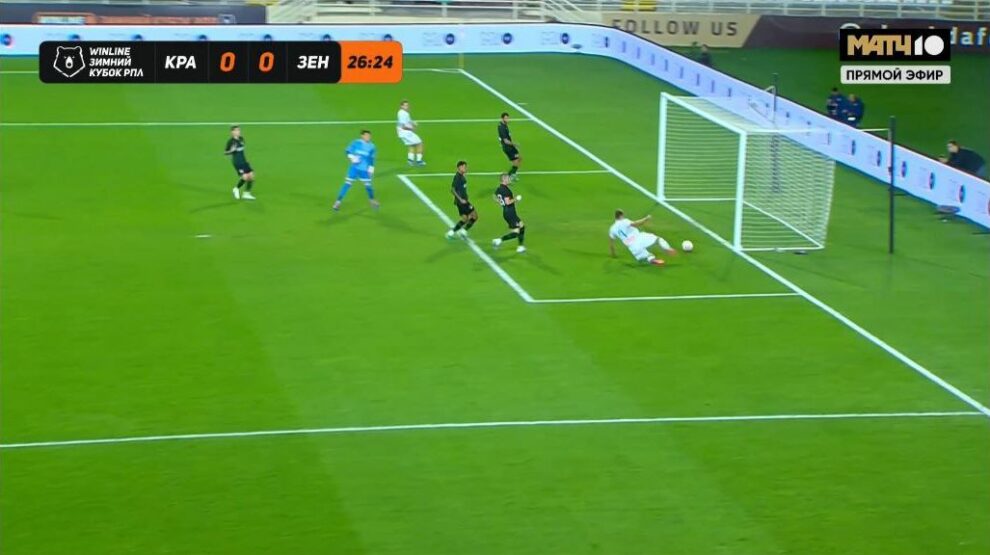 В матче Зимнего Кубка РПЛ между «Зенитом» и «Краснодаром» на 27-й минуте произошел инцидент. Нападающий петербургского клуба Александр Соболев не смог поразить пустые ворота соперника.