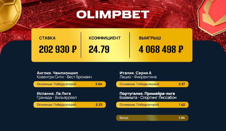 Клиент Olimpbet поставил 202 930 рублей на экспресс из четырех футбольных матчей и выиграл больше четырех миллионов рублей. Общий коэффициент, включая бонус на экспресс от букмекерской компании, — 24.79.