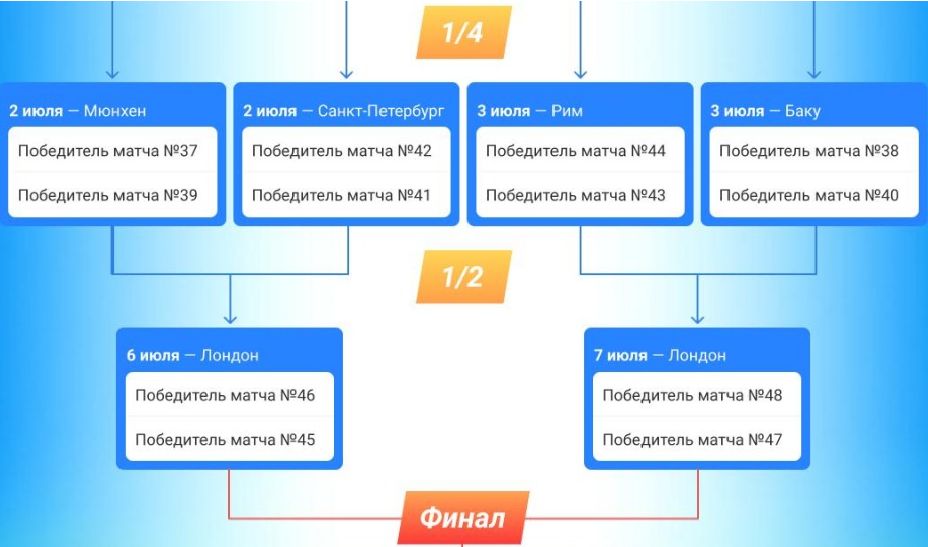 Один из четвертьфиналов пройдет в российском Санкт-Петербурге. Это будет 7-й матч Евро, который примет город на Неве. Правда, из-за ситуации с COVID-19 УЕФА оставил право за Санкт-Петербургом отказаться от проведения этой игры, если эпидемиологическая ситуация значительно ухудшится.