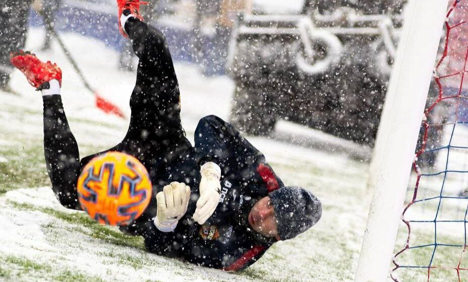 Кстати, команды играют специальным ярко-оранжевым мячом, который лучше различим на фоне заснеженного газона футбольной арены.