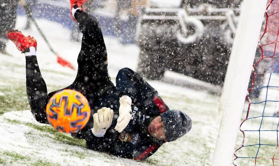 Кстати, команды играют специальным ярко-оранжевым мячом, который лучше различим на фоне заснеженного газона футбольной арены.