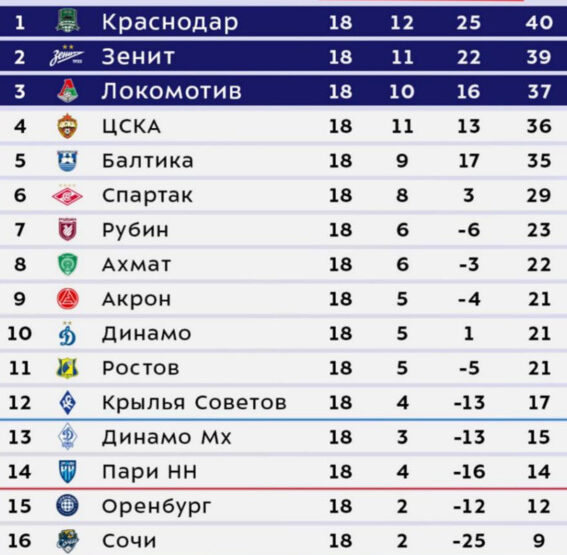 Результаты 18-го тура РПЛ и таблица после первой части сезона