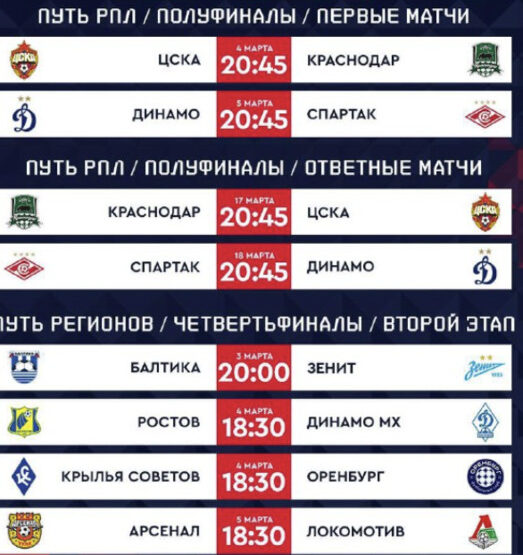 По результатам осенней части соревнований, в полуфинал Пути РПЛ вышли «Краснодар», ЦСКА, «Спартак» и московское «Динамо». Такие клубы, как «Локомотив», «Зенит», «Оренбург», «Ростов», «Крылья Советов» и махачкалинское «Динамо», продолжили борьбу в Пути регионов.