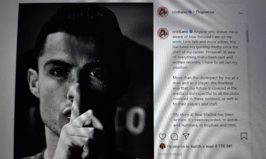 Однако сам Криштиану Роналду категорически отмел этот вариант. «Больше, чем неуважение ко мне как к человеку и как игроку, является легкомысленное освещение моего будущего в СМИ», — написал португалец в аккаунте своего инстаграма, снабдив пост черно-белой фотографией, с приложенным к губам пальцем.