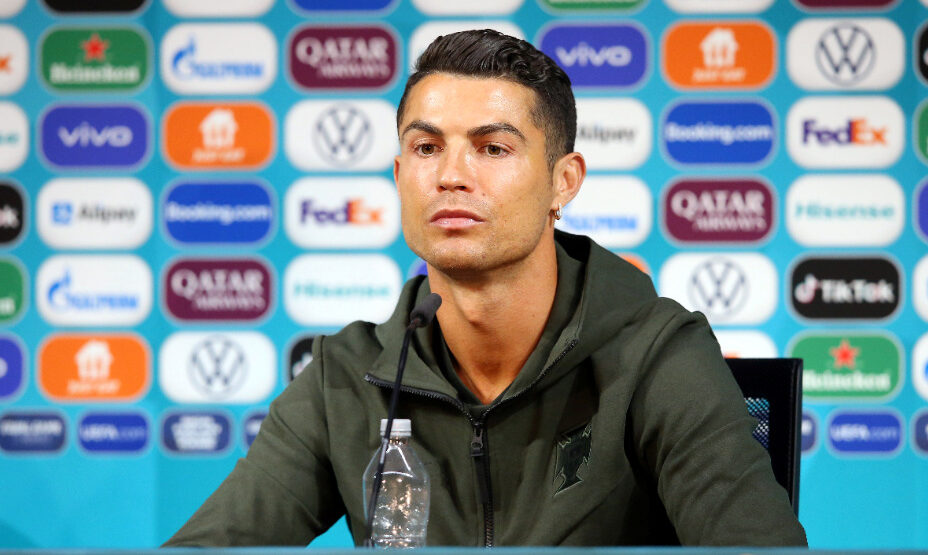 36-летний футболист, представляющий итальянский клуб «Ювентус» и сборную Португалии, общаясь с прессой, убрал со стола две бутылки с Coca-Cola. Он поставил на их место обычную питьевую воду.