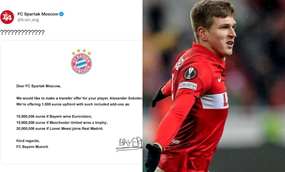 «Спартак» решил сделать собственную версию предложения «Баварии», только вместо Садио Мане они поставили Александра Соболева. Так, в шуточном «предложении» «Бавария» предлагает за Соболева всего 1 тысячу евро, но сумма может возрасти, если будут выполнены определенные условия.