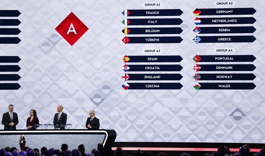 Группа 1 объединила Францию, Италию, Бельгию и Турцию. Группа 2 — Германию, Нидерланды, Сербию и Грецию. Действующий победитель турнира сборная Португалии попала в группу 4, где ее соперниками станут Дания, Норвегия и Уэльс. В группу 3 Лиги А вошли финалисты прошлого чемпионата мира — сборные Испании и Хорватии, а также команды Англии и Чехии.
