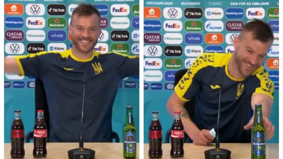Капитан украинской сборной Андрей Ярмоленко после победы во втором туре группового этапа чемпионата Европы-2020, в котором он забил гол и сделал результативную передачу, пошутил над новым флешмобом футболистов убирающих со стола для пресс-конференций спонсорские бутылки.