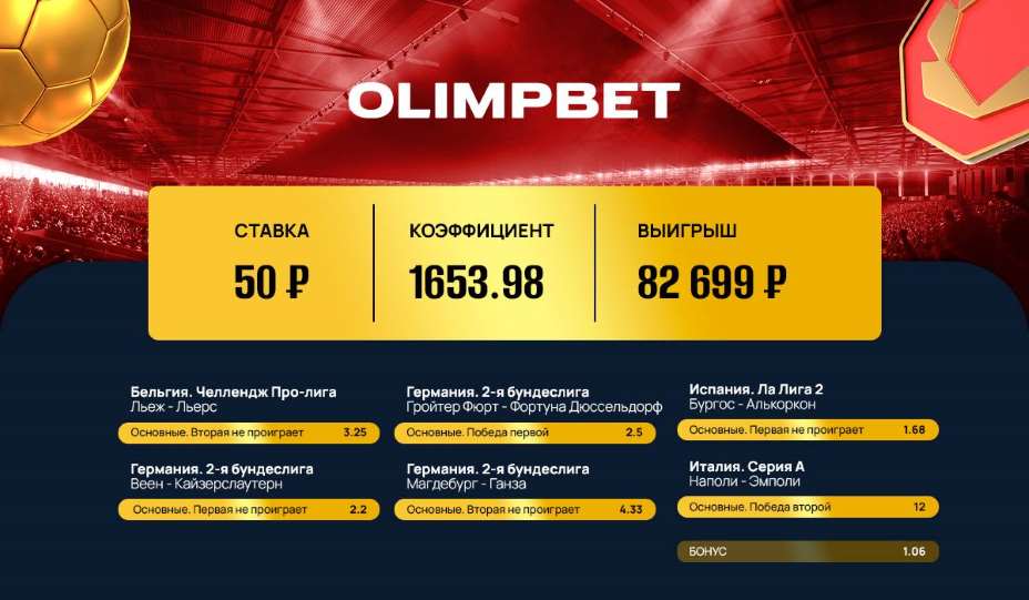 Клиент Olimpbet собрал экспресс из шести футбольных матчей с колоссальным коэффициентом — 1653.98, включая бонус на экспресс от букмекерской компании. В итоге 50 рублей ставки принесли беттору 82 699 рублей выигрыша.