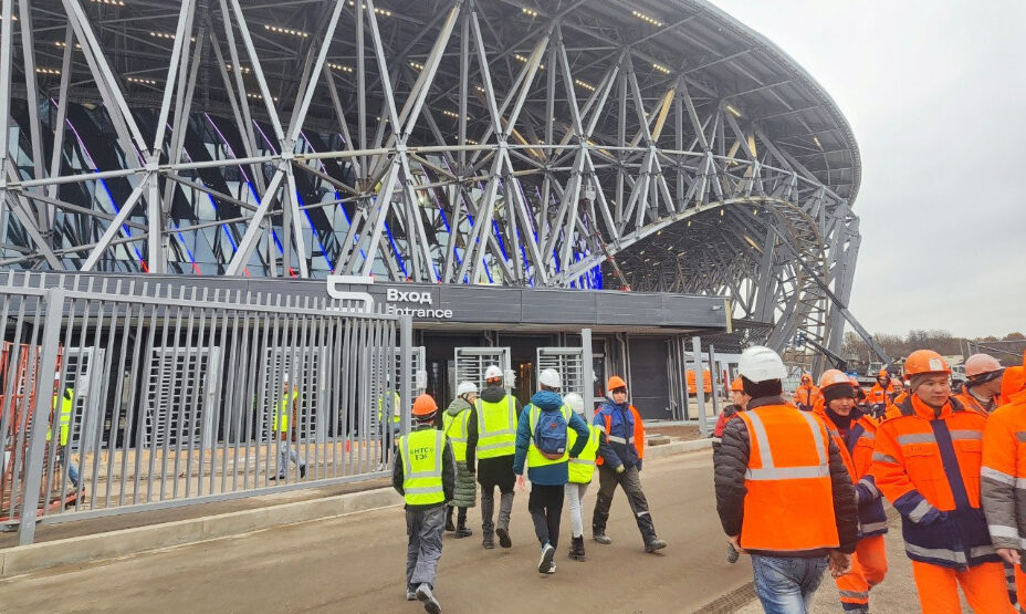 Нижний ярус трибун — убирающийся. Кресла можно сложить и ряды задвинуть. Чуть ли не в любом месте можно установить сцену. Над площадкой — один из самых больших медиа-кубов в мире. Закупить его успели еще перед санкциями
