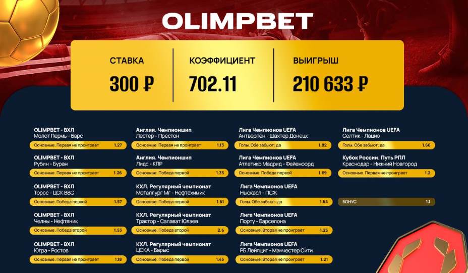 Экспресс из 17 событий принес клиенту Olimpbet 210 633 рубля