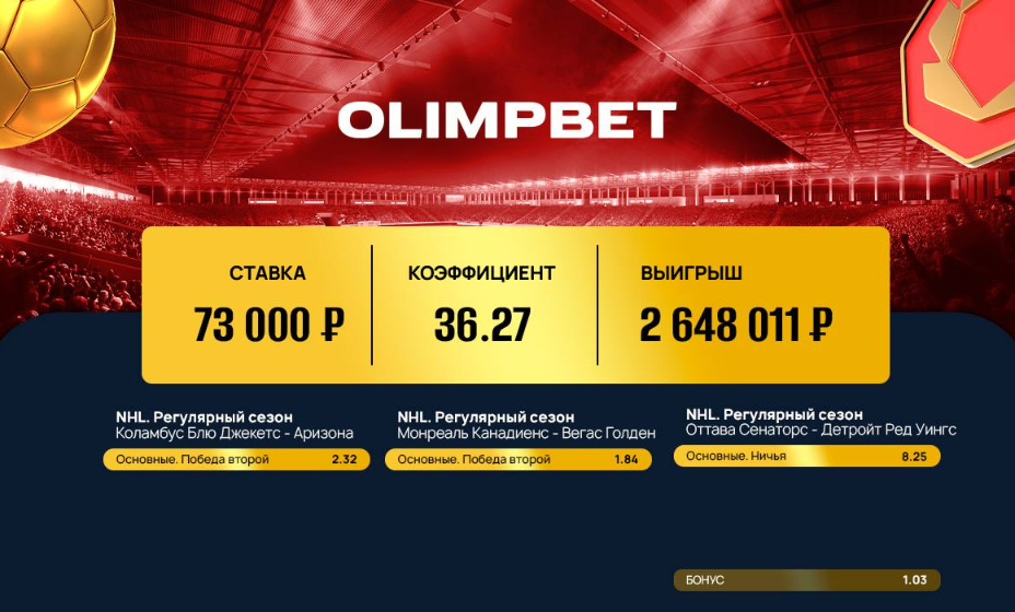 Пользователь Olimpbet включил в экспресс три матча НХЛ. Общий коэффициент купона, с учетом акции бонус на экспресс от букмекерской компании, оказался равен 36.27. Игрок поставил 73 000 рублей и выиграл 2 648 011 рублей!