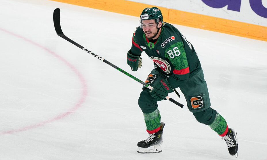 В одном из игровых эпизодов из экипировки нападающего Никиты Дыняка на лед выпал телефон.