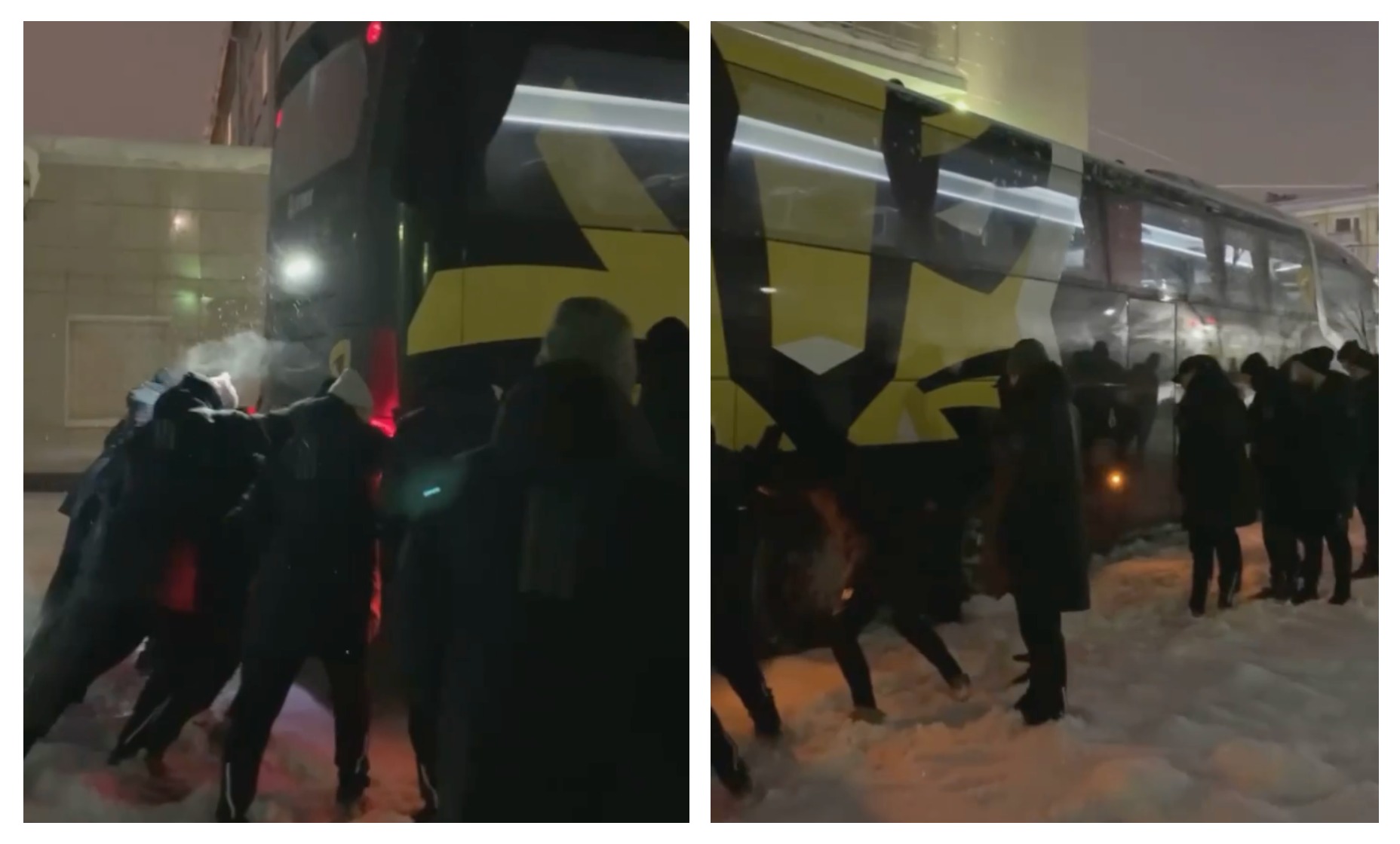Утром спортсмены попали под сильный снегопад, который и создал небольшую проблему. Игрокам пришлось толкать автобус, чтобы преодолеть препятствие.