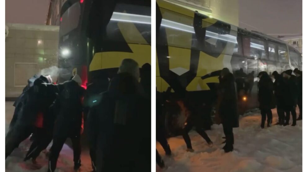 Утром спортсмены попали под сильный снегопад, который и создал небольшую проблему. Игрокам пришлось толкать автобус, чтобы преодолеть препятствие.