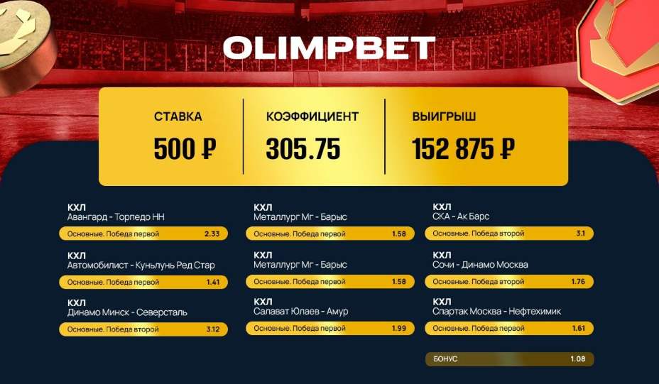 Клиент Olimpbet превратил 500 рублей в 152 тысячи благодаря экспрессу на КХЛ