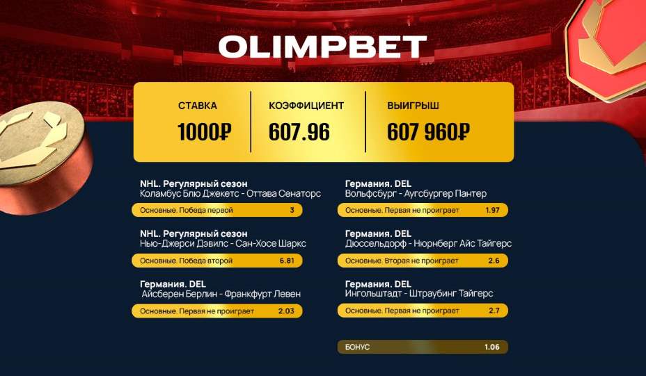 Шесть матчей из НХЛ и элитного хоккейного дивизиона Германии вошли в купон пользователя OLIMPBET. Игрок поставил 1000 и, благодаря совокупному коэффициенту 607.96 (включая бонус на экспресс от букмекерской компании), выиграл 607 906 рублей!