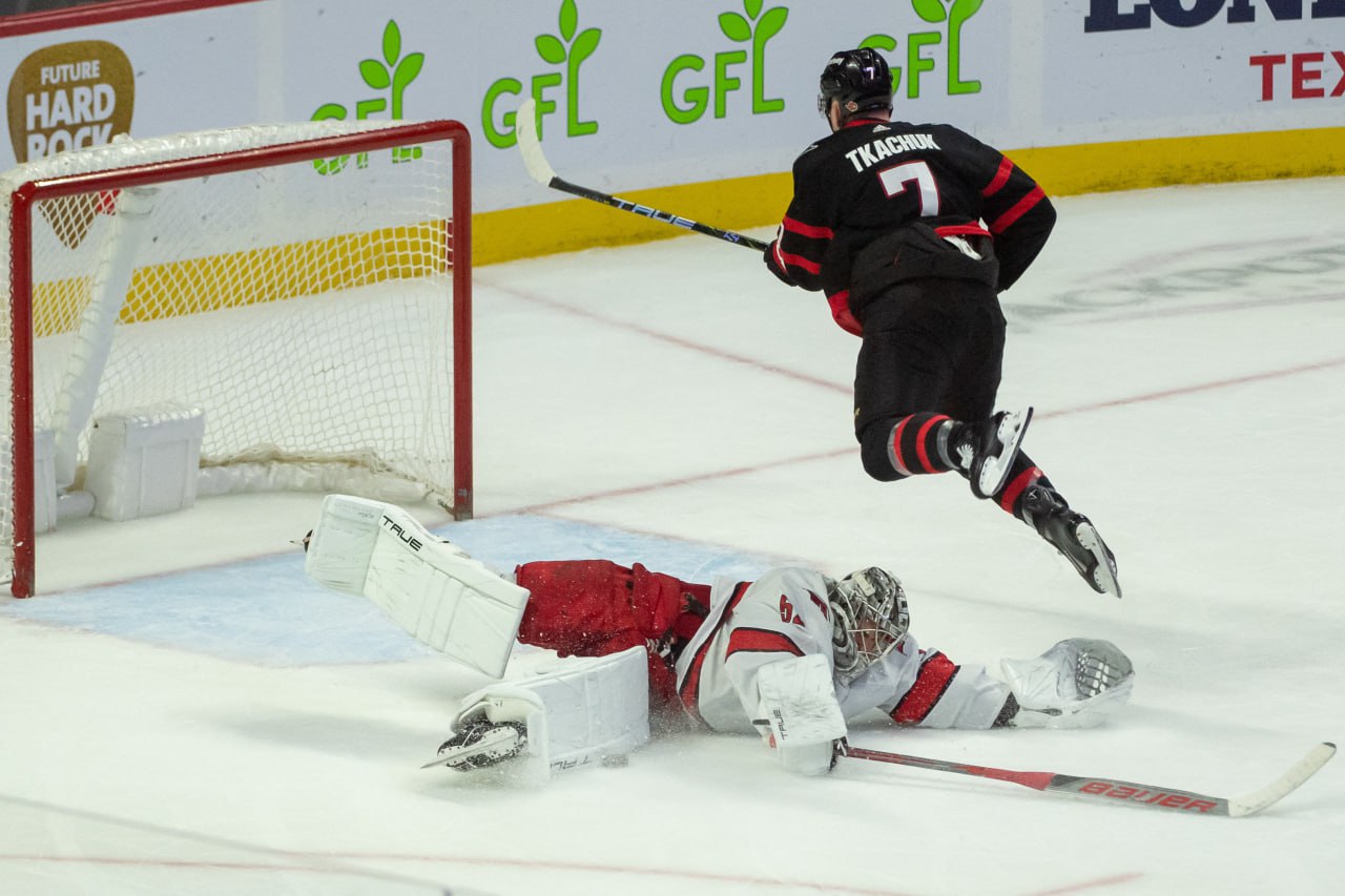 Штрафной бросок в ворота «ураганов» был назначен уже в третьем периоде за несколько минут до финальной сирены. Кочетков не испугался и эффектно бросился в коньки американцу Ткачуку, свалив лидера «сенаторов» на лед.