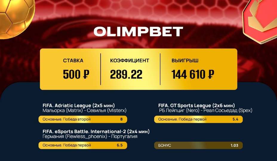 144 610 рублей принес клиенту OLIMPBET экспресс на киберфутбол
