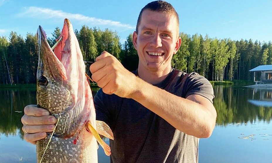 Трехкратный олимпийский чемпион проводит время с пользой – занимается рыбной ловлей. Он похвастался своим большим уловом. Его добыча, щука, даже не смогла полностью поместиться в кадр.