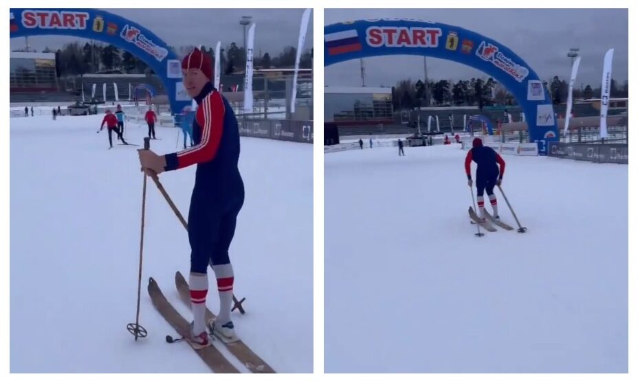 Александр по прозвищу Король лыж показал, как на улице выполняет зарядку под песню Владимира Высоцкого «Утренняя гимнастика». Стоит отметить, что на нем надета форма советских лыжников.