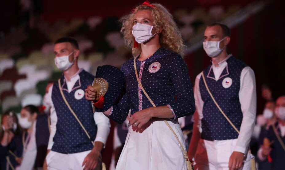 Еще один очень необычны наряд. Что получится если скрестить японские мотивы и национальные узоры Чехии? Очень необычный наряд. Вряд ли кто-то такое купит себе, но пройтись по Национальному стадиону Токио – вполне себе! А узор из крестиков на синем фоне непростые – это силуэт гимнастки Веры Чеславки, которая побеждала в Токио-64.