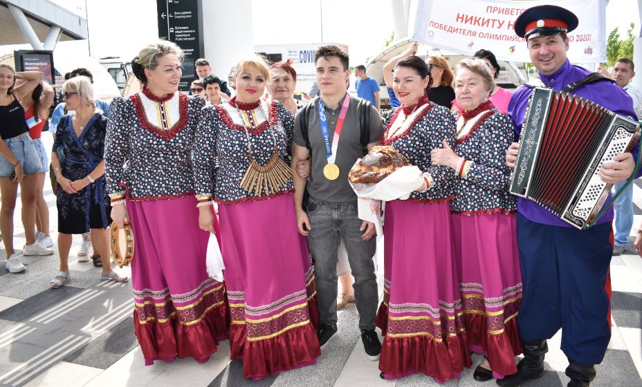 Флаги, песни казачьего ансамбля, каравай — все в лучших традициях донского гостеприимства. Такая картинка ждала Никиту на улице. Поздравить гимнаста приехал Сергей Бурлаков — российский спортсмен-паралимпиец и член общественной палаты РФ. Он поблагодарил Никиту за мотивацию и за вклад в развитие российского спорта. Родители Никиты — Наталья и Владимир Нагорные — поздравили сына с победой и надеются, чтобы он почаще приезжал на родную землю.