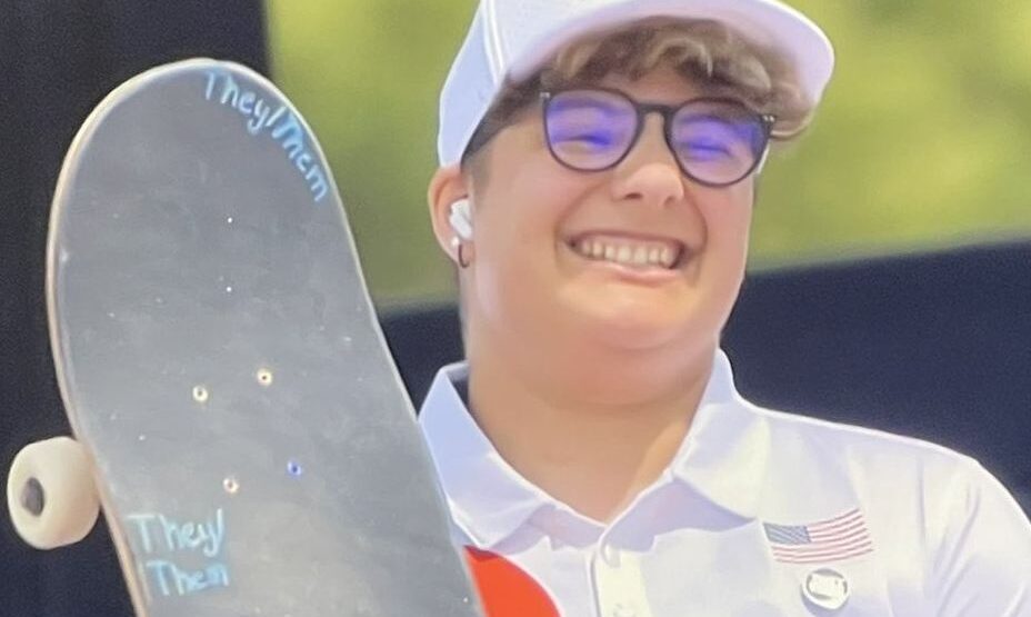 Журналисты, которые описывали выступление спортсмена использовали местоямения «она» и «ее». Скейтбордистка же настаивает на обращение «они» или «их». Подобные слова написаны на ее скейтборде.