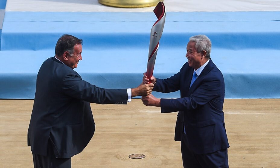 Ранее огонь по традиции зажгли в Древней Олимпии, оттуда его перевезли на афинский Акрополь. Красочная церемония второй раз прошла без зрителей из-за пандемии коронавируса. Также была сокращена и эстафета олимпийского огня: в Греции в ней участвуют всего три факелоносца, два греческих спортсмена и один китайский.