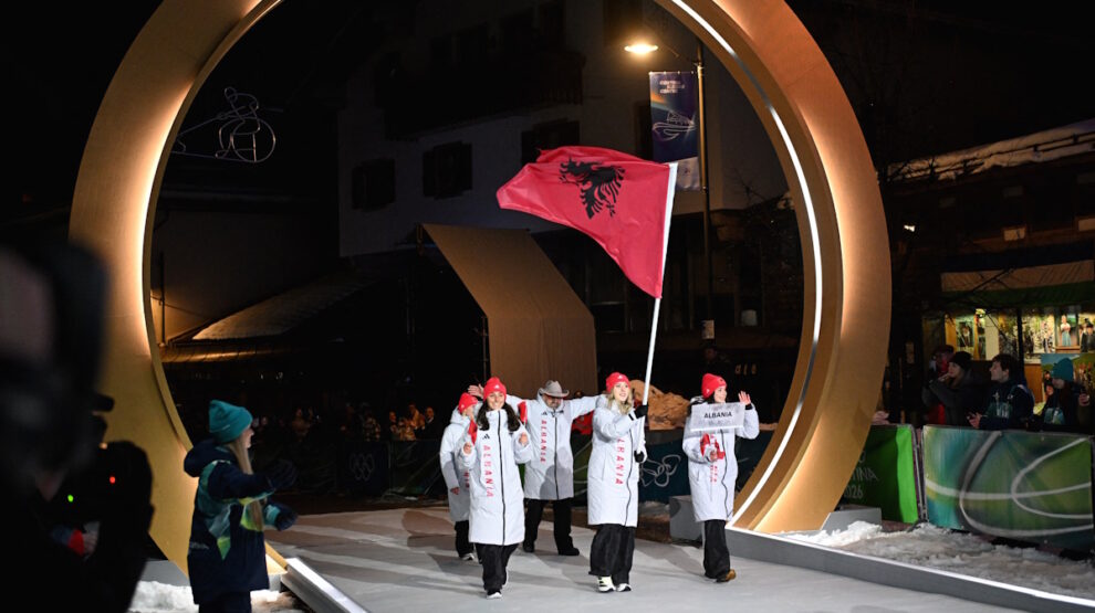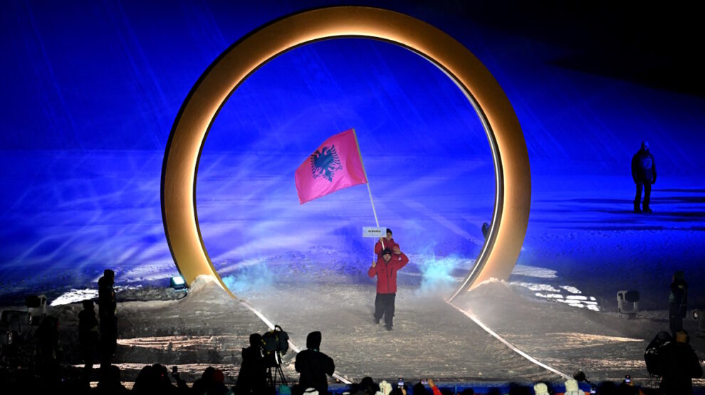 22:53. Все это выглядит вот так — спортсмены с одним флагом синхронно выходят в разных локациях. Пример — сборная Албании в Ливиньо и Кортине.