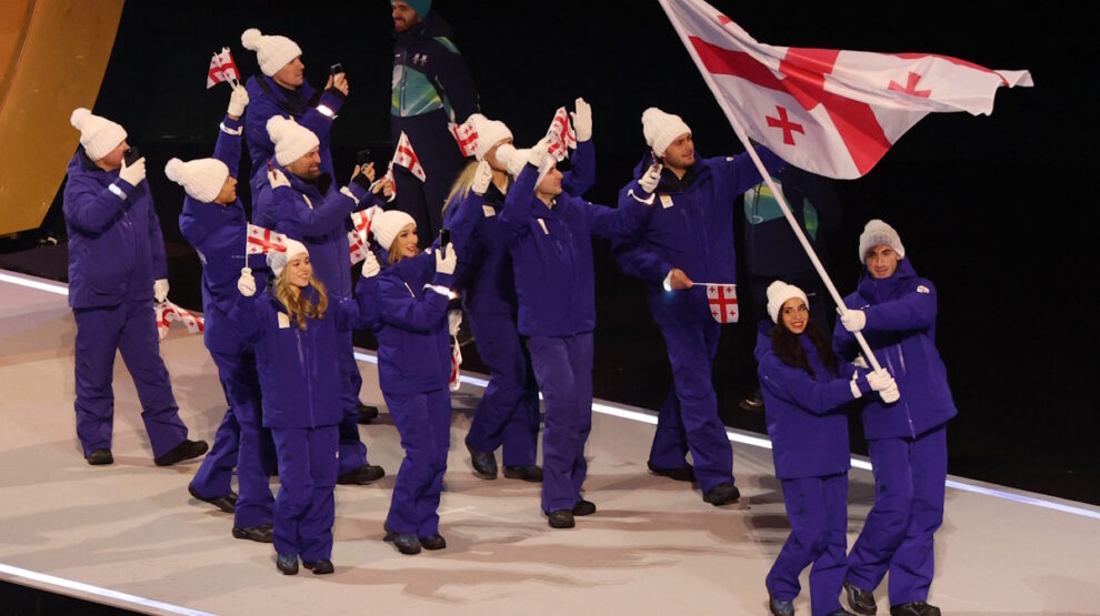 23:50. Вот знаменосцы сборной Грузии — дочь Этери Тутберидзе Диана Дэвис.