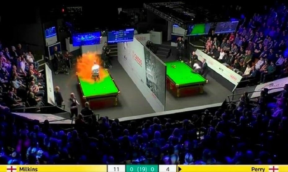 В Шеффилде, а именно там проводится турнир, один из них залез на стол во время партии между англичанами Робертом Милкинсом и Джо Пэрри. В итоге представители движения Just Stop Oil облили все порошковой оранжевой краской.