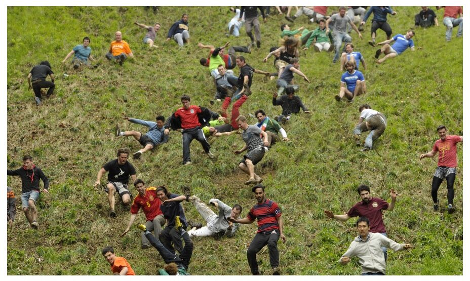 В Великобритании впервые после пандемии коронавируса прошло экстремальное мероприятие — Куперсхиллская сырная гонка, участники которой спускаются с холма в погоне за колесом сыра Double Gloucester. Дистанция для ловцов сыра составляет около 182 метров, а вес гигантской головки — 3 кг. Примечательный факт, что сыр развивает скорость до 130 км/ч, и многие участники не могут удержаться на ногах во время забега и покидают дистанцию с различными травмами.