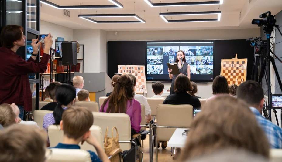 Показательную партию для юных шахматистов провели чемпионка мира по рапиду и блицу Алиса Юнкер и чемпион мира среди школьников и победитель первенства Азии Глеб Щеглов.