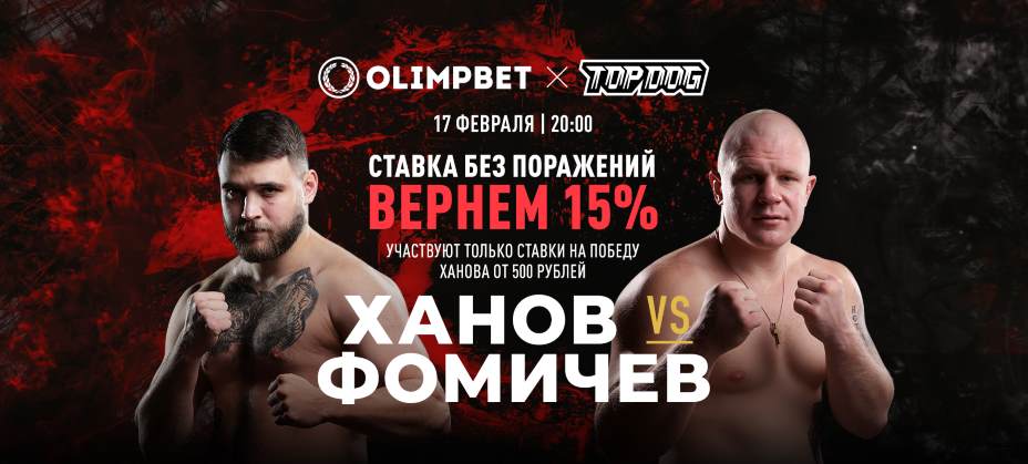 Olimpbet, генеральный партнер Top Dog, запустил акцию к одному из самых ожидаемых кулачных боев начала года. Делайте ставки на победу амбассадора компании Ханова, а если он проиграет, то букмекер вернет 15% от суммы.