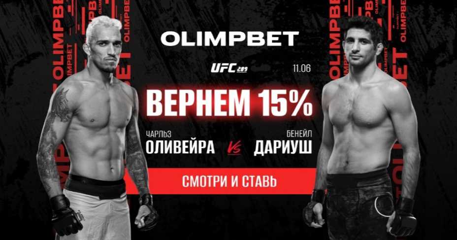 Olimpbet покажет UFC 289 в прямом эфире и уже запустил акцию перед главным боем недели в мире единоборств. Букмекерская компания вернет 15% от ставки на победу Оливейры, если он проиграет.