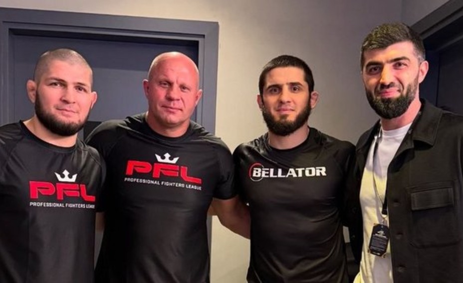 Он стоит вместе с менеджером Ризваном Магомедовым, действующим чемпионом UFC в легком весе Исламом Махачевым и российским бойцом Федором Емельяненко.