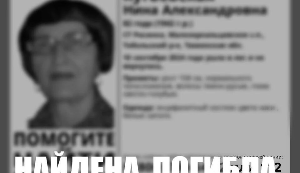 В Тобольском районе нашли мертвой 82-летнюю Нину Кугаевскую, пропавшую около месяца назад. Информацию об этом URA.RU предоставили через горячую линию поискового отряда «ЛизаАлерт». Поиски женщины, матери тренера сборной Тюменской области по биатлону Максима Кугаевского, начались 10 сентября.