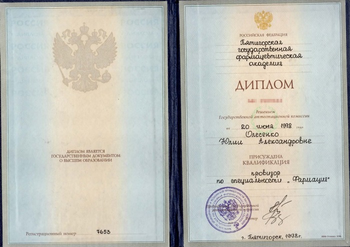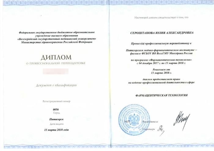 Пятигорская фармацевтическая академия. Присуждена квалификация: Провизор по специальности «Фармация»
