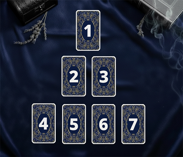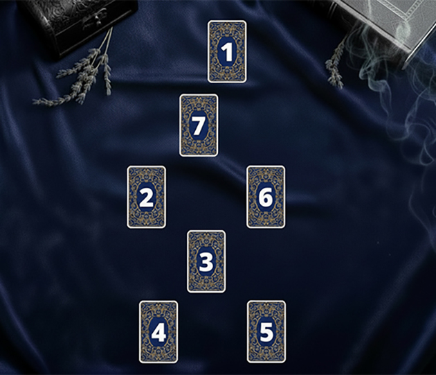 Из перетасованной колоды вынимается семь карт и раскладываются в форме пирамиды, в которой будут лежать карты: №1 (слева) и №7 (справа). Над ними — номера №2 и №6, а еще выше — №3 и №5. Венчает пирамиду карта под №4. После этого можно приступать к интерпретации будущих событий: