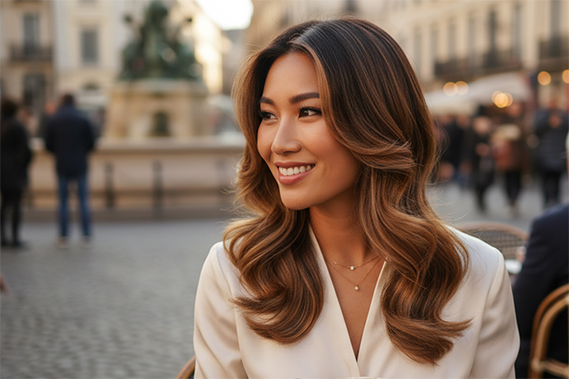 Пряди переливаются на свету десятками теплых нюансов — от мягкого карамельного до насыщенного шоколадного. Такой эффект достигается за счет особого подхода к окрашиванию: мастер выстраивает индивидуальную цветовую палитру, которая гармонирует с природным тоном кожи и волос.