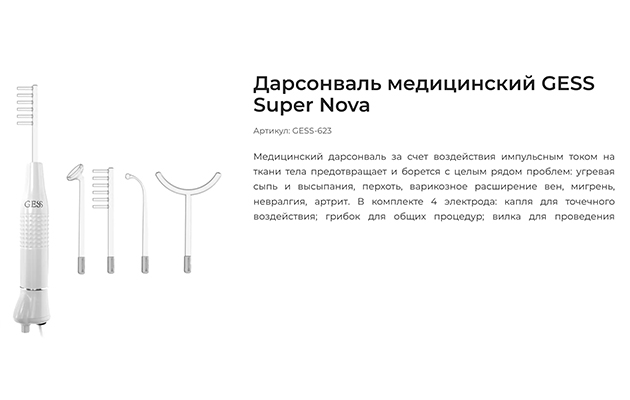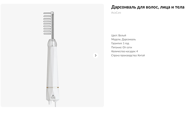 Прибор оснащен плавной регулировкой мощности, что делает уход максимально точным и комфортным. Комплект прочных стеклянных насадок надежно фиксируется и предназначен для разных задач: грибовидная — для тела, гребешковая — для кожи головы, лепестковая и каплевидная — для омоложения и тонизирования лица. Дарсонваль поставляется в стильной подарочной коробке с русскоязычной инструкцией и гарантией на год.