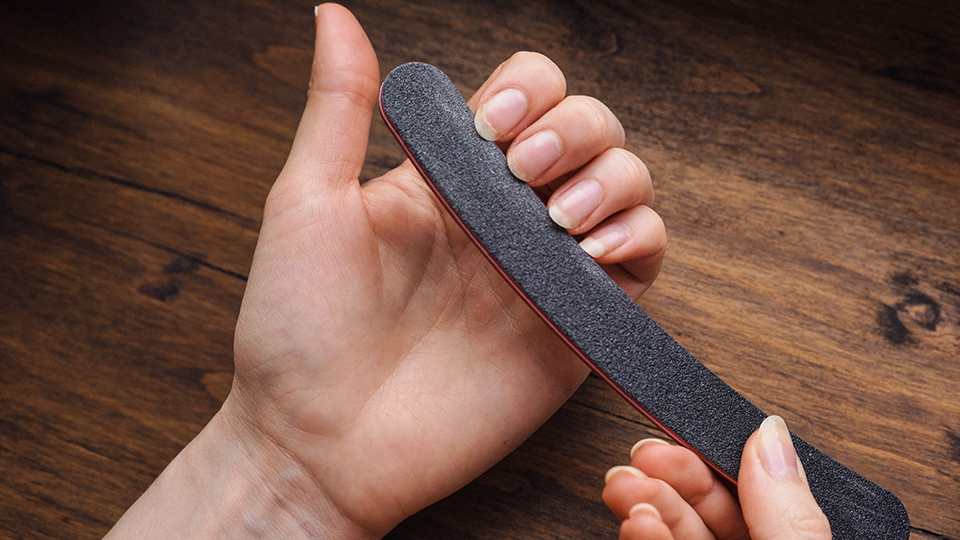 2. Слегка запилите покрытия. Удалите верхний слой топа мягкой пилкой 180–240 грит. Цель — не истончить ноготь, а разрушить глянцевый защитный слой, чтобы ремувер смог проникнуть в материал. Если блеск полностью исчез, вы все сделали правильно.