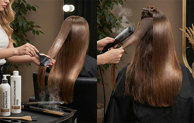 — Кератиновое выпрямление — это процедура интенсивного восстановления волос с использованием кератина и силиконов. Эти компоненты проникают в структуру волос, создают защитную пленку, обогащают волосы и защищают их от вредных воздействий.