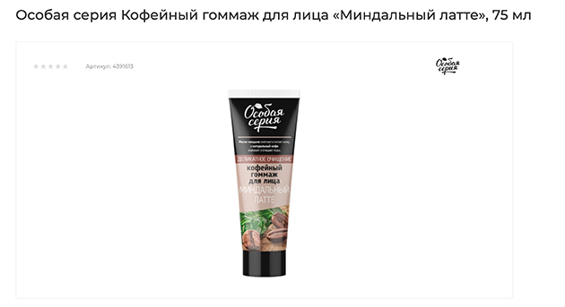 Отличительная особенность этого средства — аромат латте с нотками шоколада и карамели. В качестве абразива используется натуральная измельченная кофейная крошка, которая деликатно очищает поры, не раздражая и не вызывая ощущения стянутости. Другим активным компонентом является миндальное масло (4). Оно питает и увлажняет кожу, придавая ей здоровый и ухоженный вид.